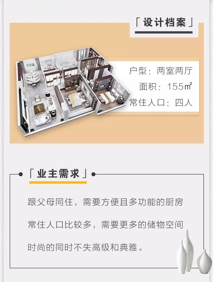 ??業(yè)主與父母同住,需要方便且多功能的廚房。常駐人口比較多,需要更多的儲物空間,時尚的同時又不失高級和典雅。