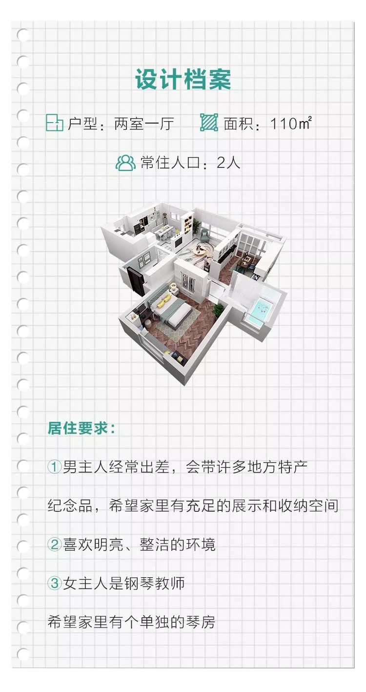 ??男主人經常出差,會帶許多地方特產紀念品,希望家里有充足的展示和收納空間。女主人是個鋼琴教師,希望家里有個單獨的琴房。他們二人喜歡明亮、整潔的環(huán)境。
