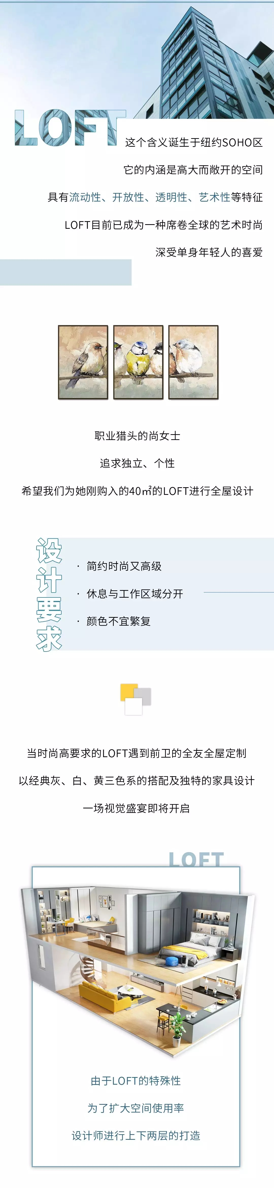 ??LOFT,這個含義誕生于紐約SOHO區(qū)。它的內(nèi)涵是高大而敞開的空間,具有流動性、開放性、透明性、藝術(shù)性等特征。LOFT目前已成為一種席卷全球的藝術(shù)時尚,深受單身年輕人的喜愛。本案例中,業(yè)主是職業(yè)獵頭的尚女士,追求獨立、個性,希望我們?yōu)樗徣氲?0㎡的LOFT進行全屋設(shè)計。