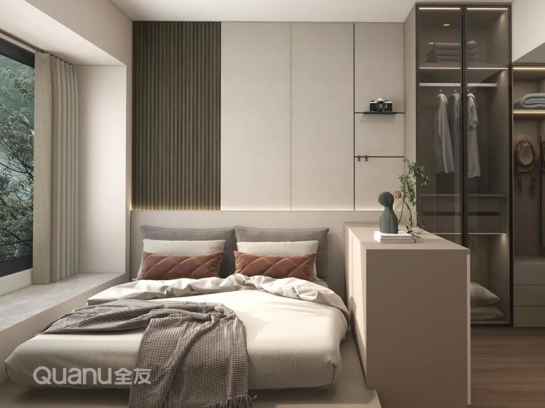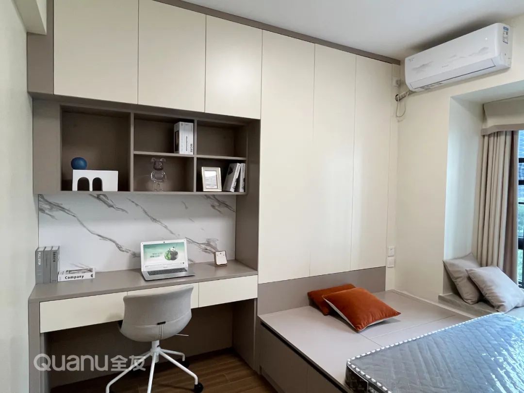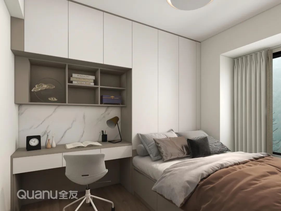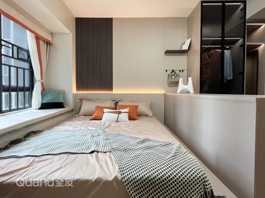 ? 床頭向床尾處延展出齊腰儲(chǔ)物柜,既增加了收納空間,又能充當(dāng)床頭柜擱置雜物,睡覺時(shí)還安全感十足。