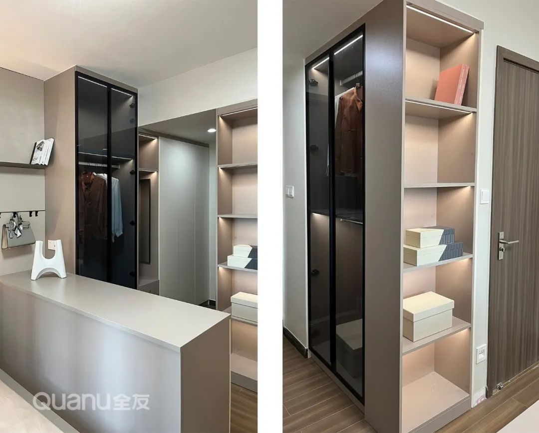 ? 設(shè)計(jì)師根據(jù)墻體結(jié)構(gòu)定制衣柜,透明柜門、開放格+燈帶設(shè)計(jì),衣物掛放一目了然,拿取更便捷。