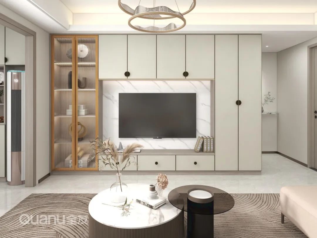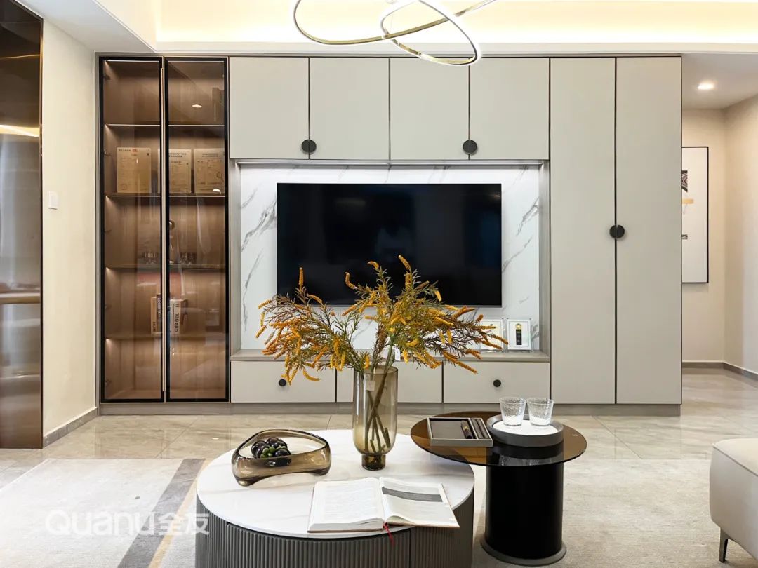 ? 客廳定制“回字型”電視柜,古典圓形拉手增添古樸感。透明柜門、雙環(huán)主燈、大理石背景墻、高低茶幾共同營(yíng)造出輕奢氛圍,與悠悠雅韻和諧過渡,盡顯空間美學(xué)。