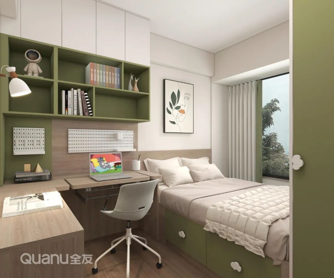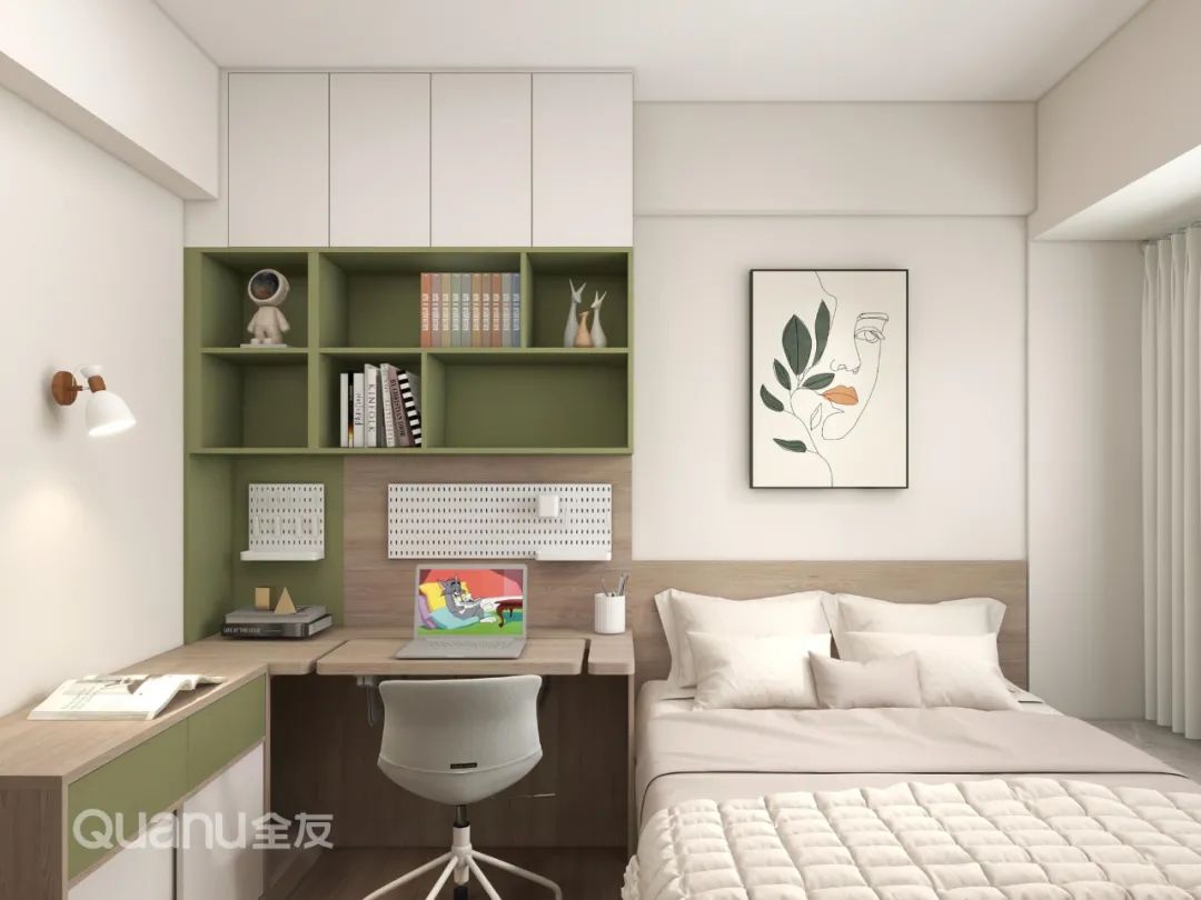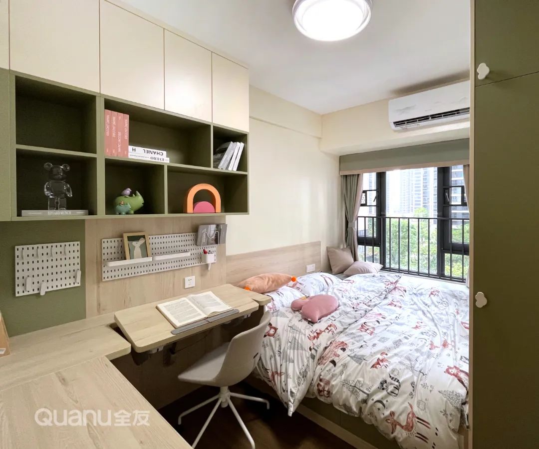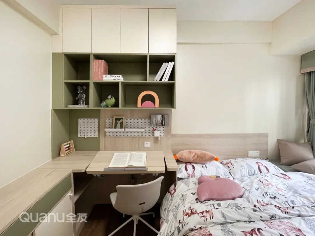 ? 為了更符合孩子審美,兒童房摒棄了新中式設(shè)計(jì),采用果綠色與淺木紋搭配,定制書桌柜、衣柜+榻榻米組合柜,同時(shí)滿足岑先生孩子的學(xué)習(xí)、儲(chǔ)物與睡眠需求。