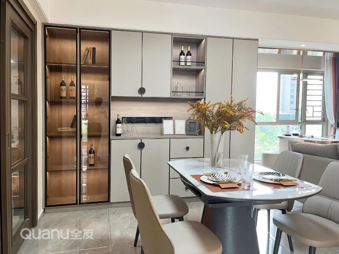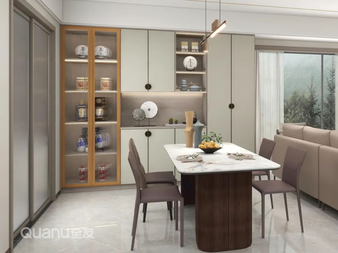 ? 餐邊柜風(fēng)格與電視柜保持一致,玻璃柜門+掩門虛實(shí)結(jié)合,藏露相宜。中間留出操作臺(tái),搭配移動(dòng)軌道插座,安全又靈活。