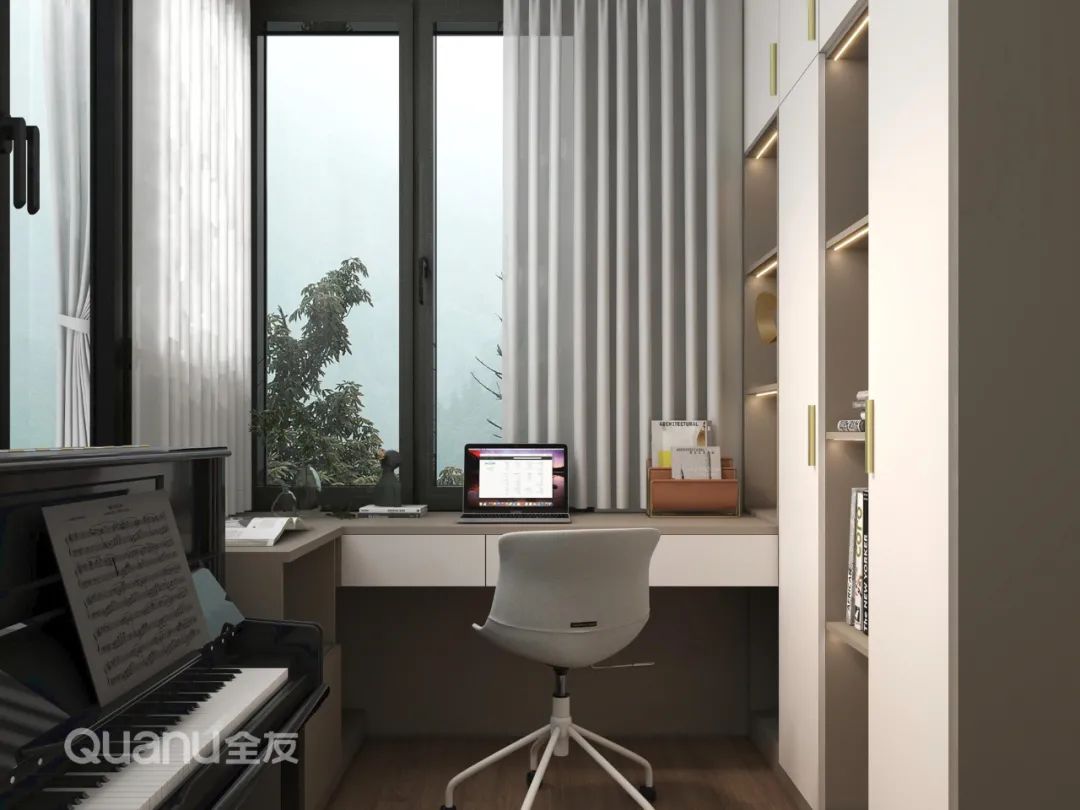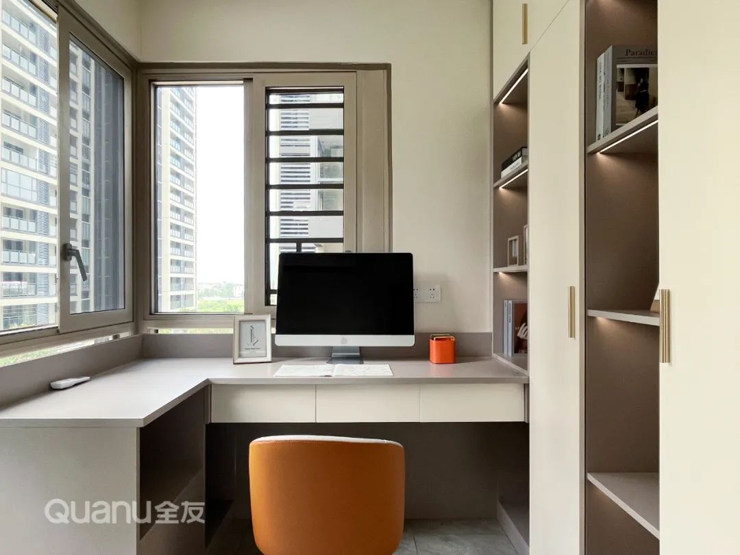 ? 陽(yáng)光房采光優(yōu)越,用來(lái)做書房再合適不過。L型書桌+半開放式書柜設(shè)計(jì),儲(chǔ)物與展示兼?zhèn)洌梢噪S手拿放辦公所需的資料與書籍。工作疲憊時(shí)還能遠(yuǎn)眺窗外,放松身心,愜意又閑適。