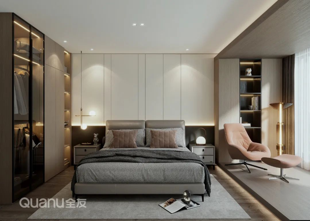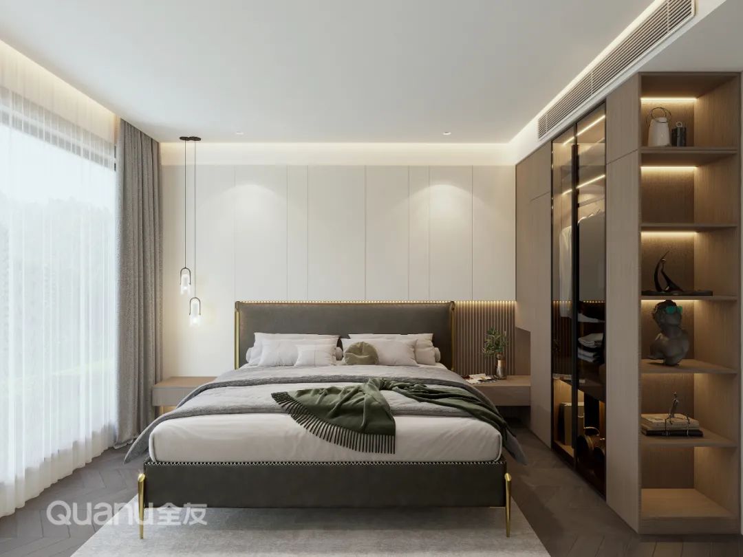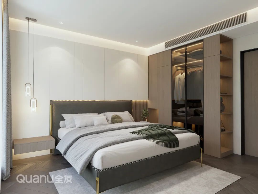 床頭精準(zhǔn)內(nèi)嵌,形成有序的美學(xué)節(jié)奏,衣柜留出開放格,延展出臺面充當(dāng)床頭柜,懸空設(shè)計輕巧靈動,整體性更強。