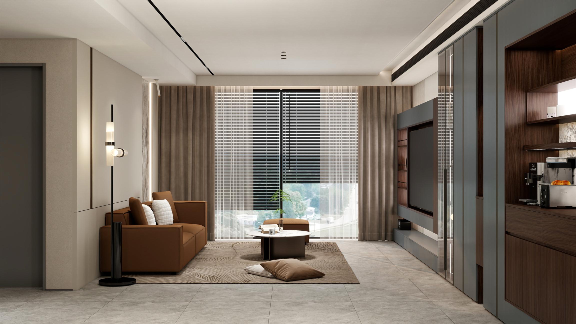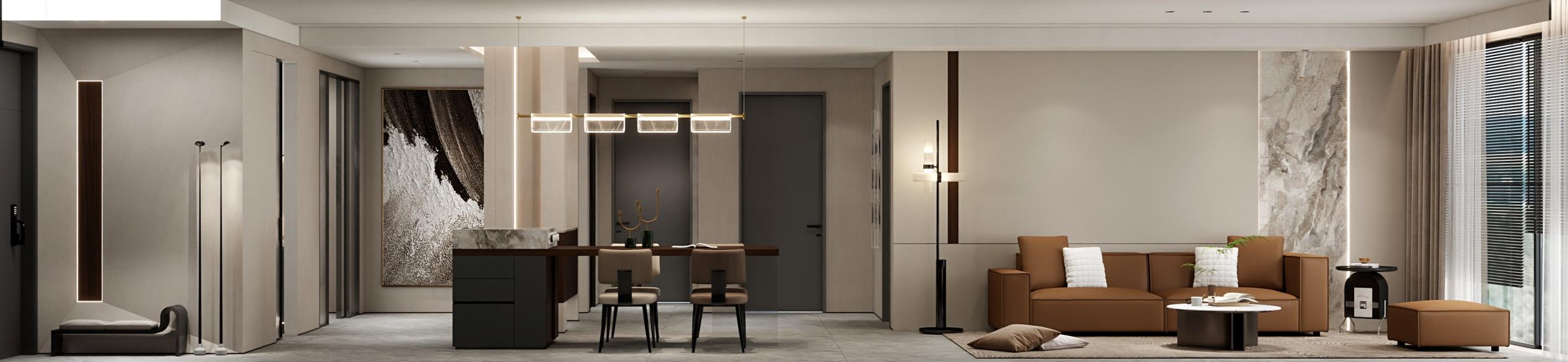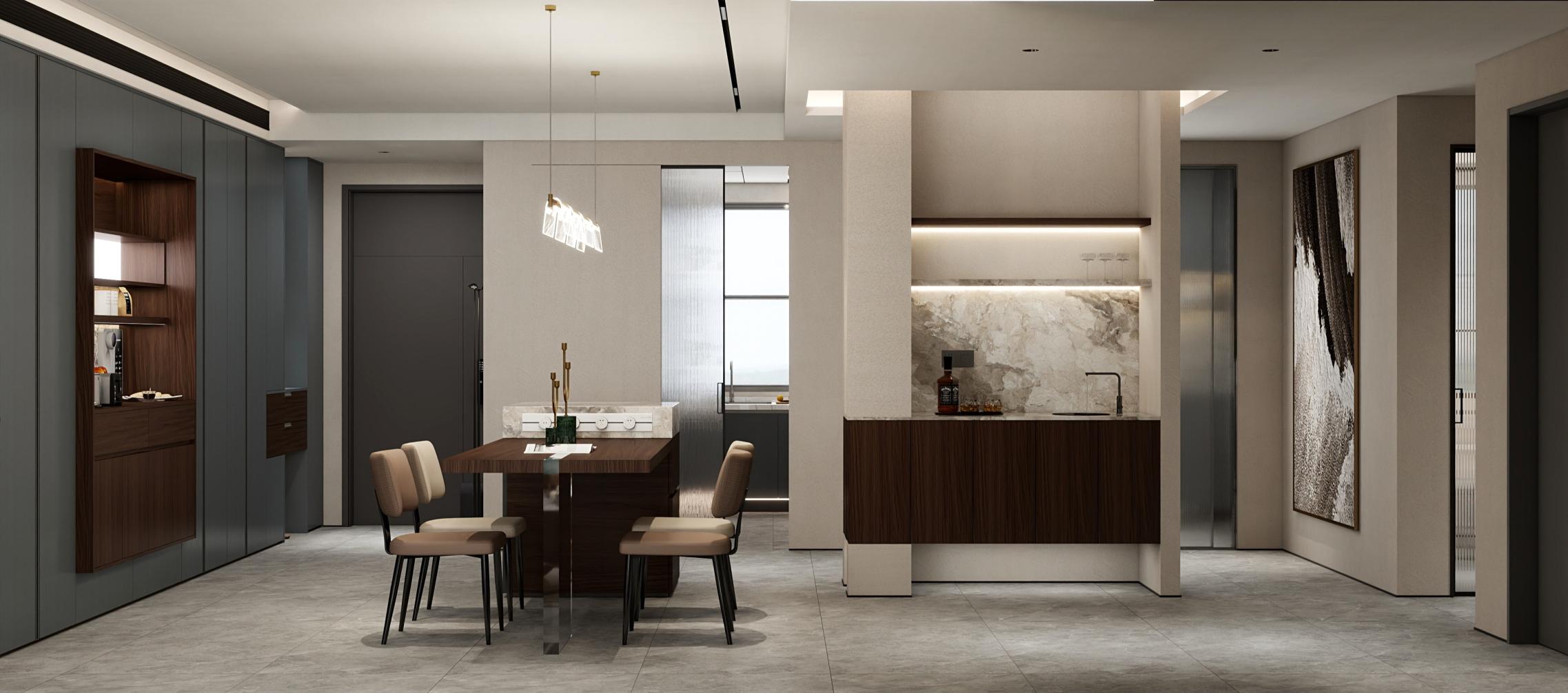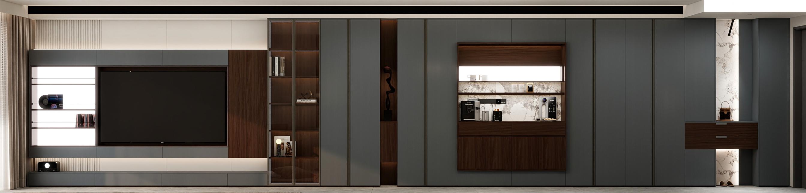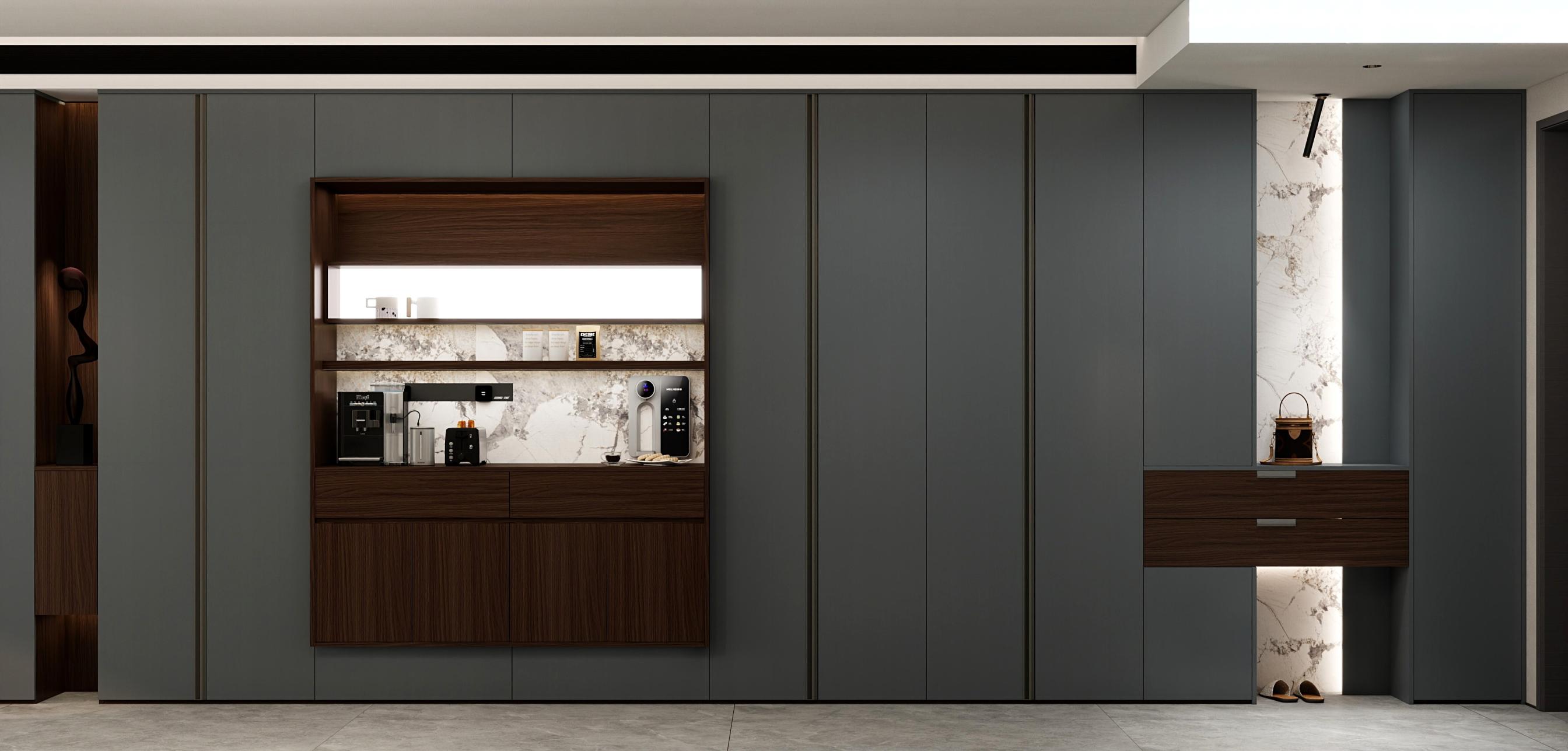 【空間定位】品質顧客;意式極簡;產品大面積灰色門板搭配深色木紋,硬裝再以咖色中和冷調,打造咖色系品質空間;