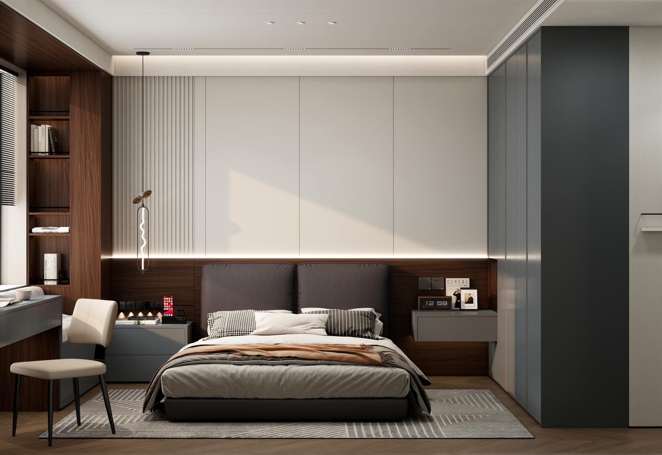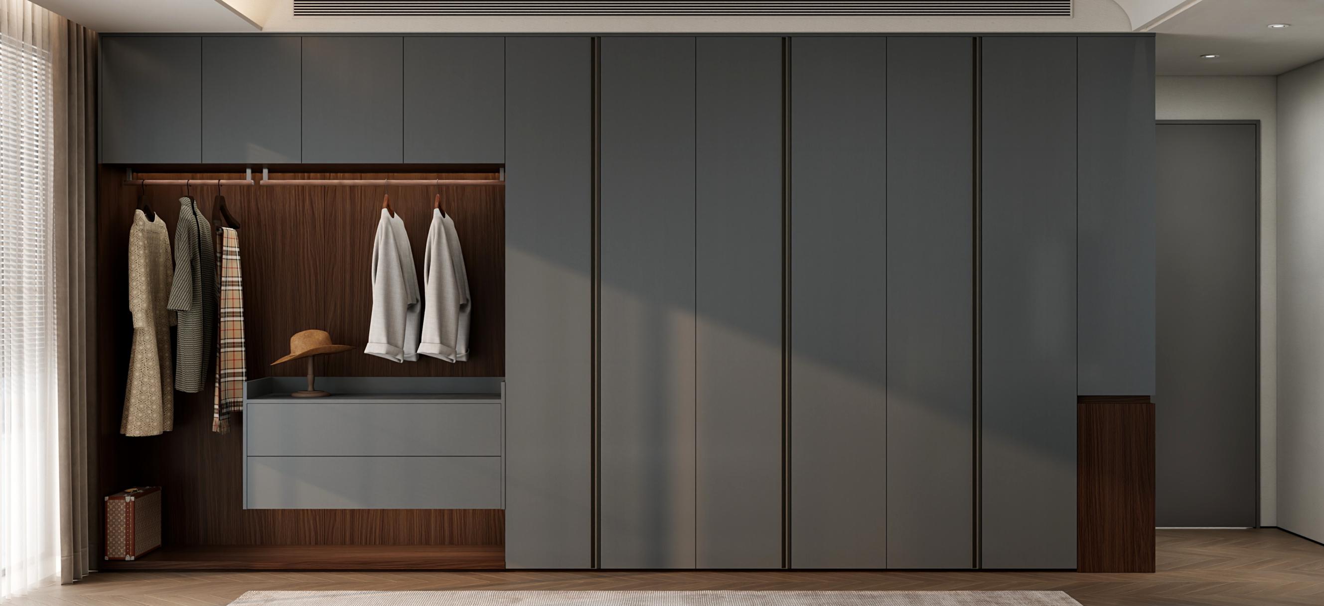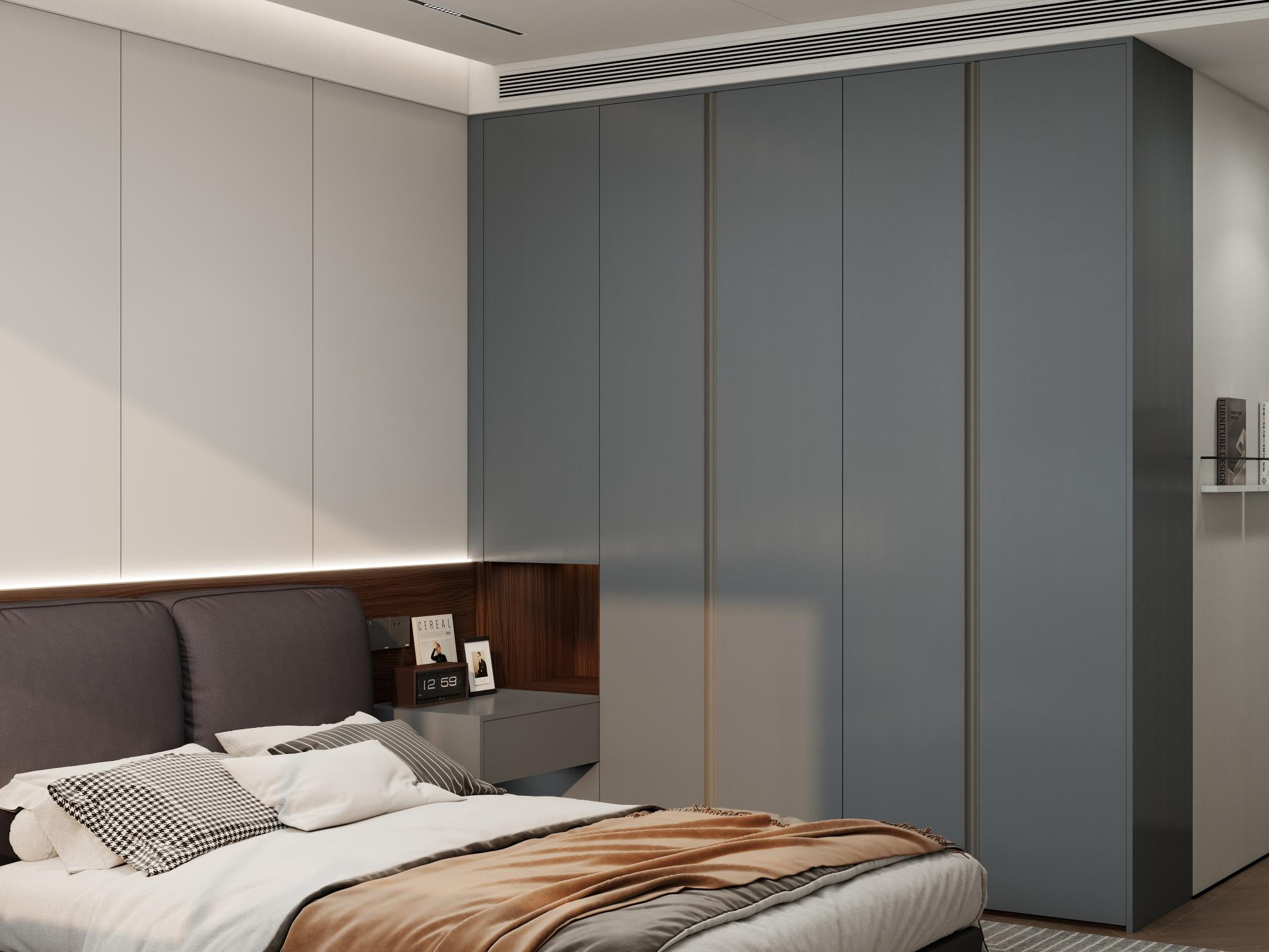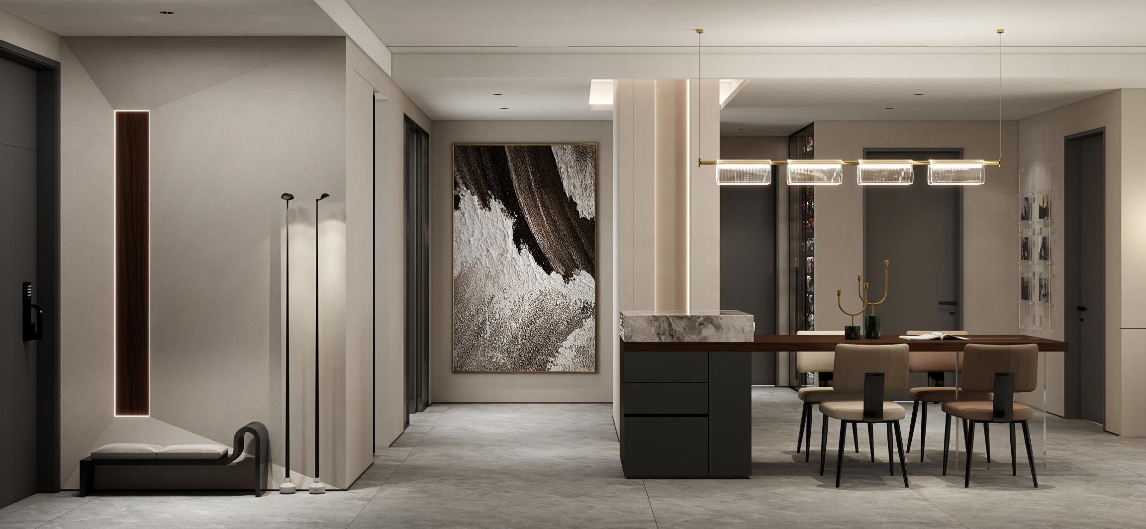 【空間定位】品質顧客;意式極簡;產品大面積灰色門板搭配深色木紋,硬裝再以咖色中和冷調,打造咖色系品質空間;