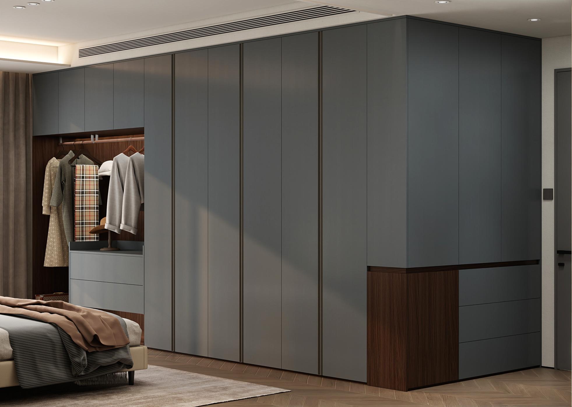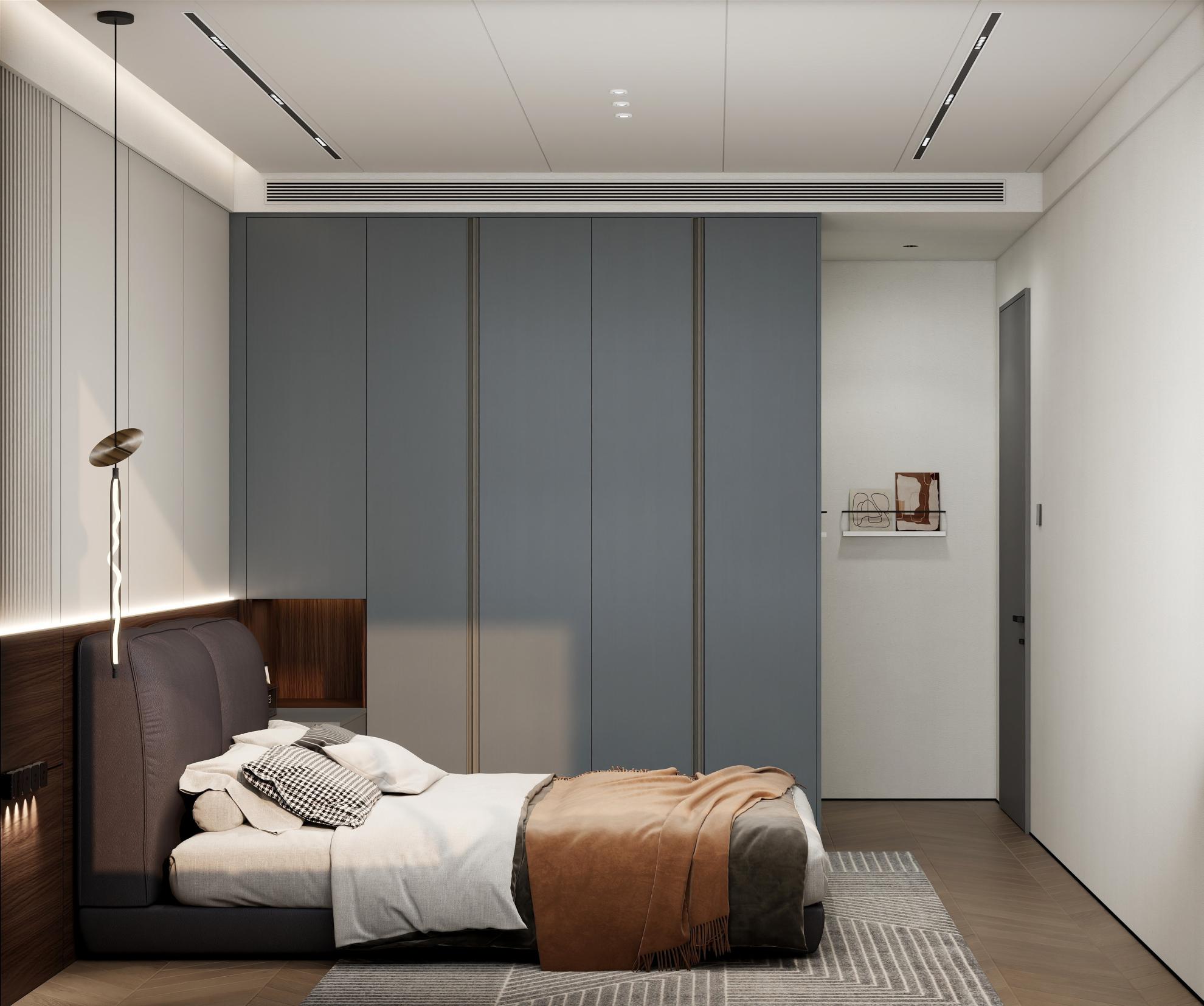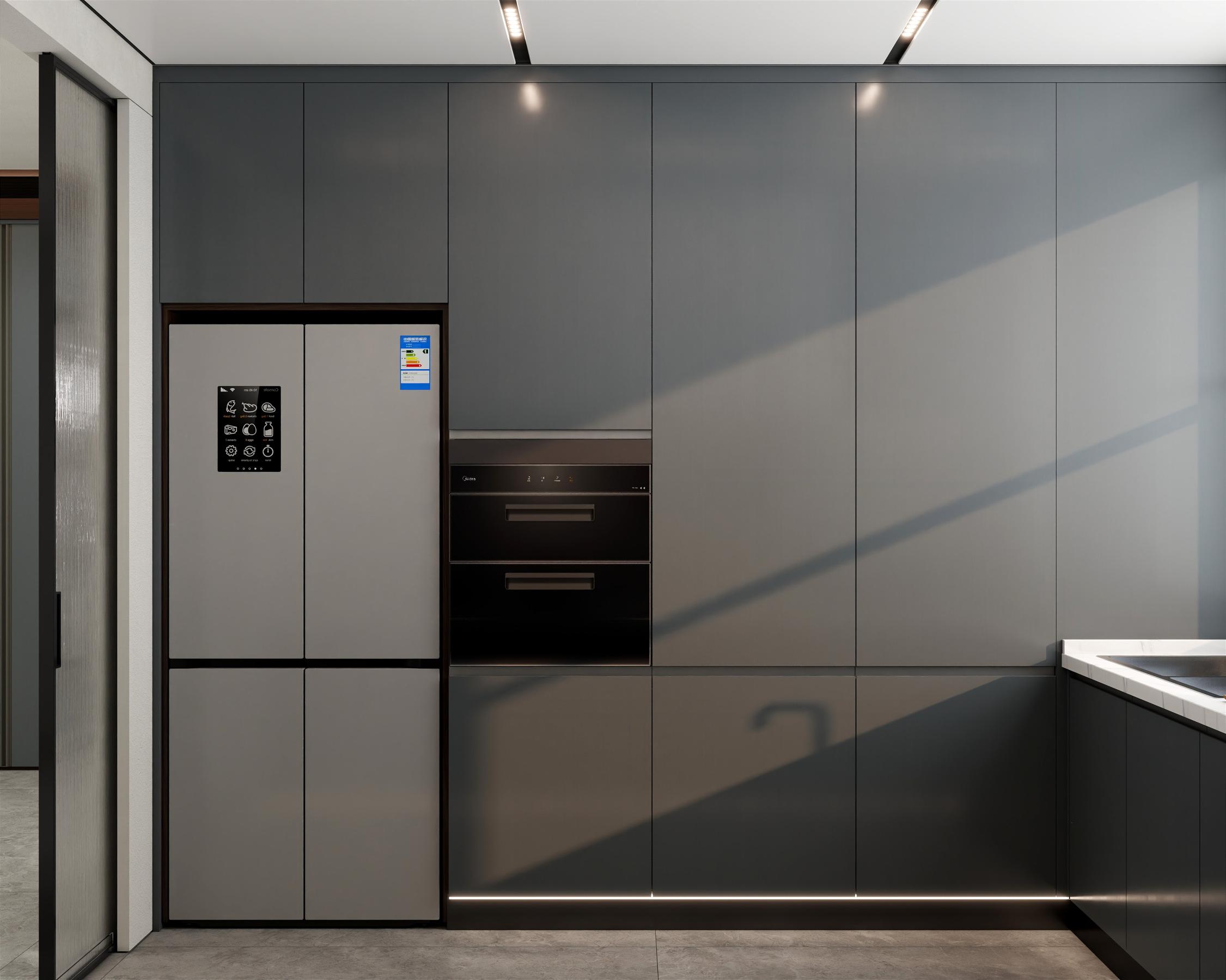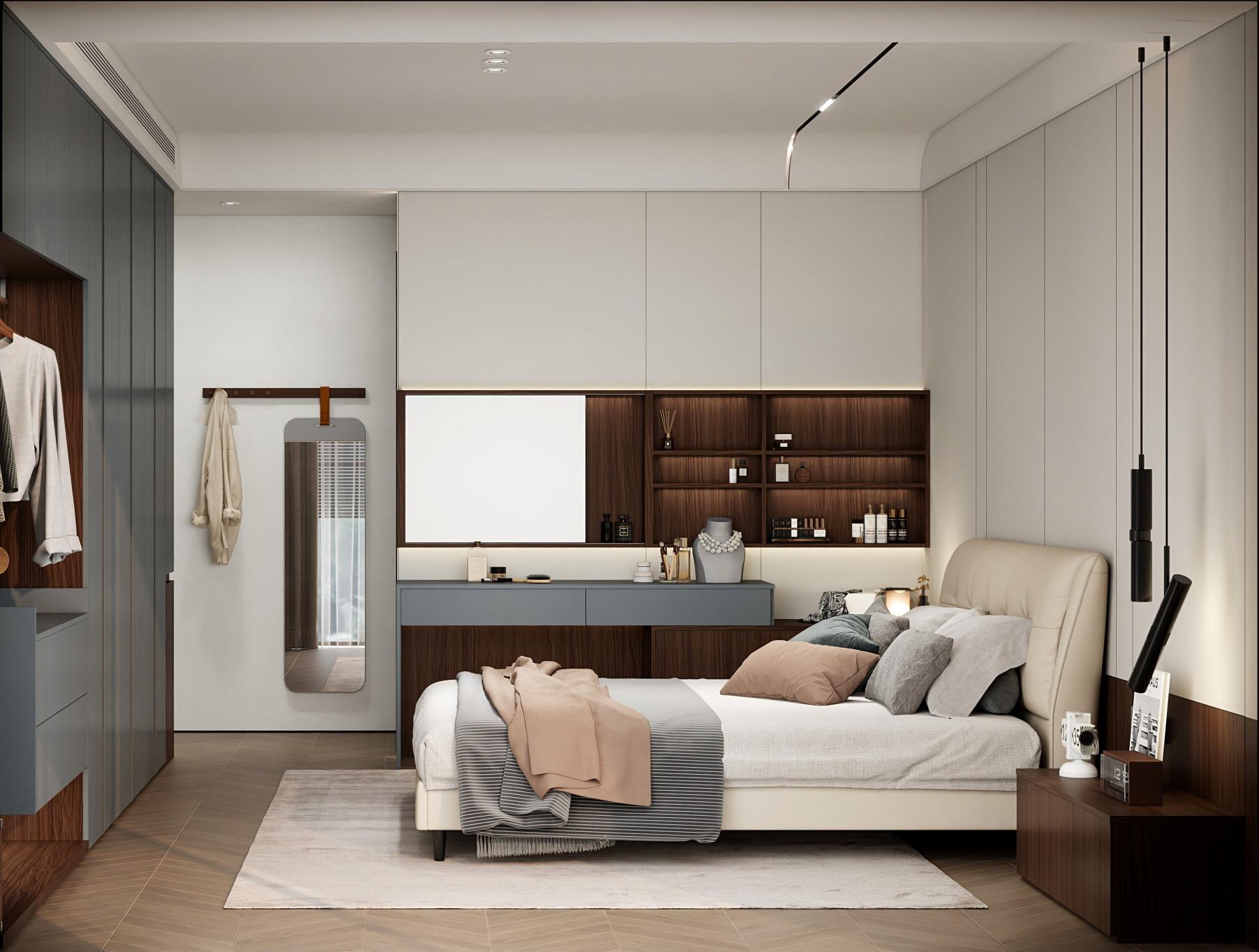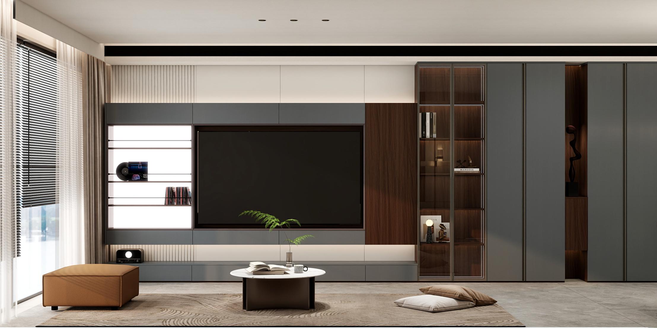 【空間定位】品質顧客;意式極簡;產品大面積灰色門板搭配深色木紋,硬裝再以咖色中和冷調,打造咖色系品質空間;