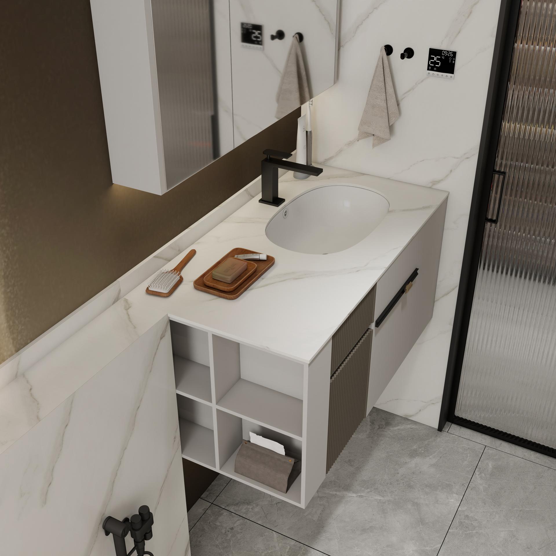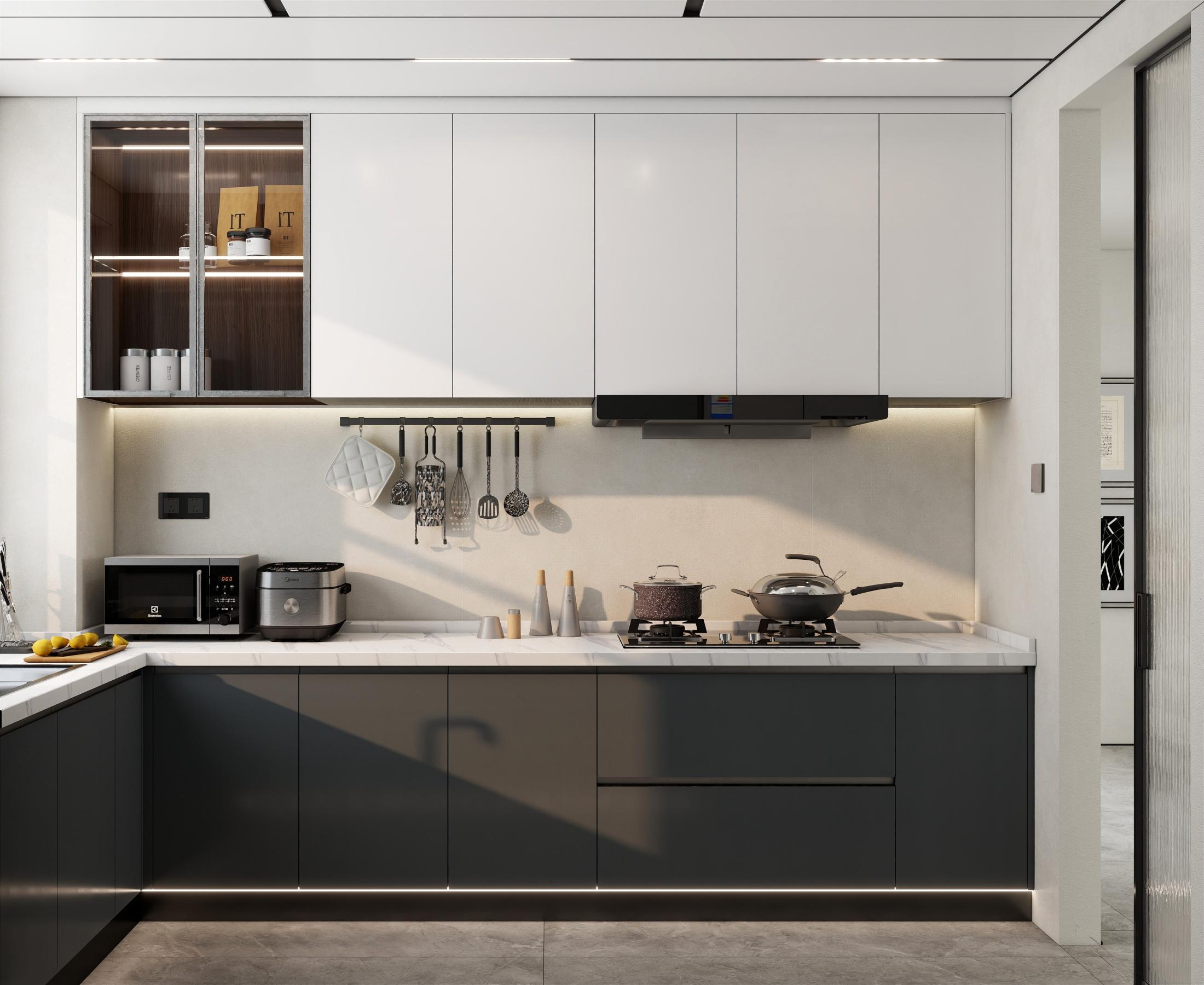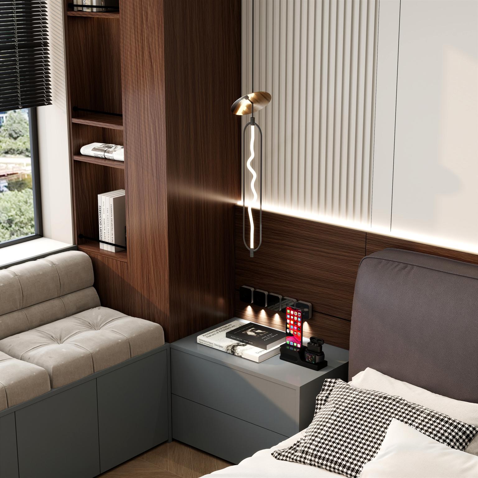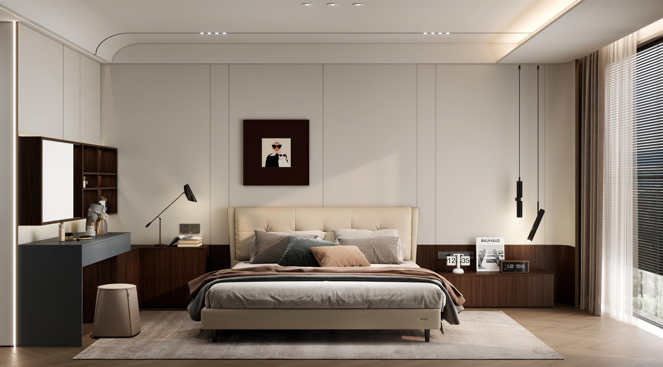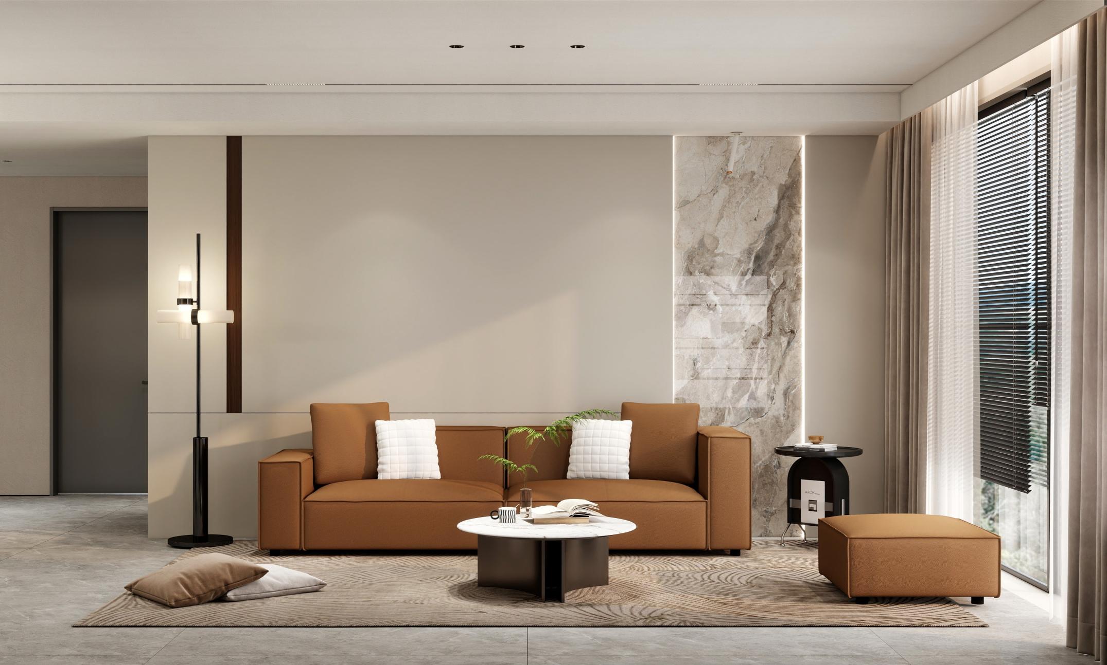 【空間定位】品質顧客;意式極簡;產品大面積灰色門板搭配深色木紋,硬裝再以咖色中和冷調,打造咖色系品質空間;