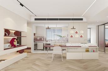 業(yè)主夫婦生活注重儀式感,需要居家辦公學(xué)習環(huán)境,有一女兒,喜歡草莓熊。全屋設(shè)計采用紅+白的高級感配色,“草莓熊”為整個空間設(shè)計的靈感繆斯。