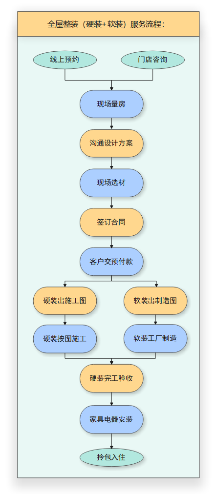 ? 線上預(yù)約 / 門店咨詢 → 現(xiàn)場量房 → 溝通設(shè)計(jì)方案 → 現(xiàn)場選材 → 簽訂合同 → 客戶交預(yù)付款→ (硬裝+軟裝)出圖 → 硬裝按圖施工+軟裝工廠制造 → 硬裝完工驗(yàn)收 → 軟裝家具、電器安裝 → 拎包入住